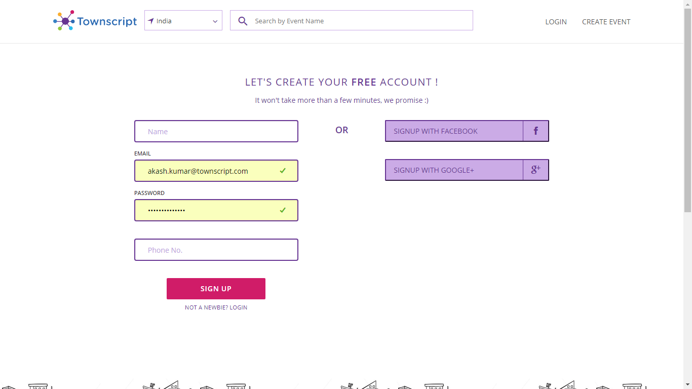 If you are new to Townscript and don't have an account with us, you can sing up using your email id.